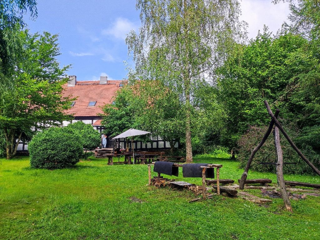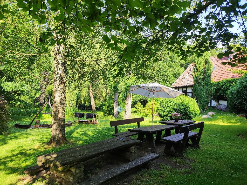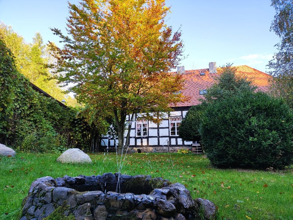 Die Alte Oberförsterei: inmitten von urwüchsiger pommerscher Landschaft lädt sie ein zum Abschalten und Entspannen. Waldluft, sauberes Wasser und unendliches Grün. 7750 Quadratmeter Privatland umgeben das Forsthaus und sorgen für Ruhe und Abgeschiedenheit. Der Forsthof steht, mit Ausnahme des privaten Wirtschaftteils, den Gästen zur Verfügung. Vor dem Forsthaus bieten ein Volleyballnetz, eine Schaukel und eine Wiese die Möglichkeiten sportlicher Aktivität. Im Forstgarten befinden sich die Feuerstelle, ein artesischer Brunnen und ein Teich. Ein kleiner Fluss am Ende des Gartens lädt zum Baden und zum Angeln ein. |